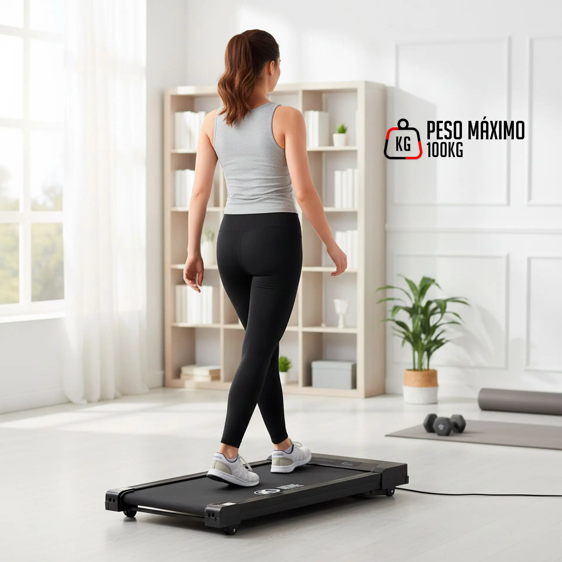 Diseño Ultra Compacto (Walking Pad): El chasis de bajo perfil y el tamaño reducido están diseñados para deslizarse fácilmente debajo de un escritorio, cama o sofá, maximizando el espacio en cualquier habitación o cubículo de oficina.