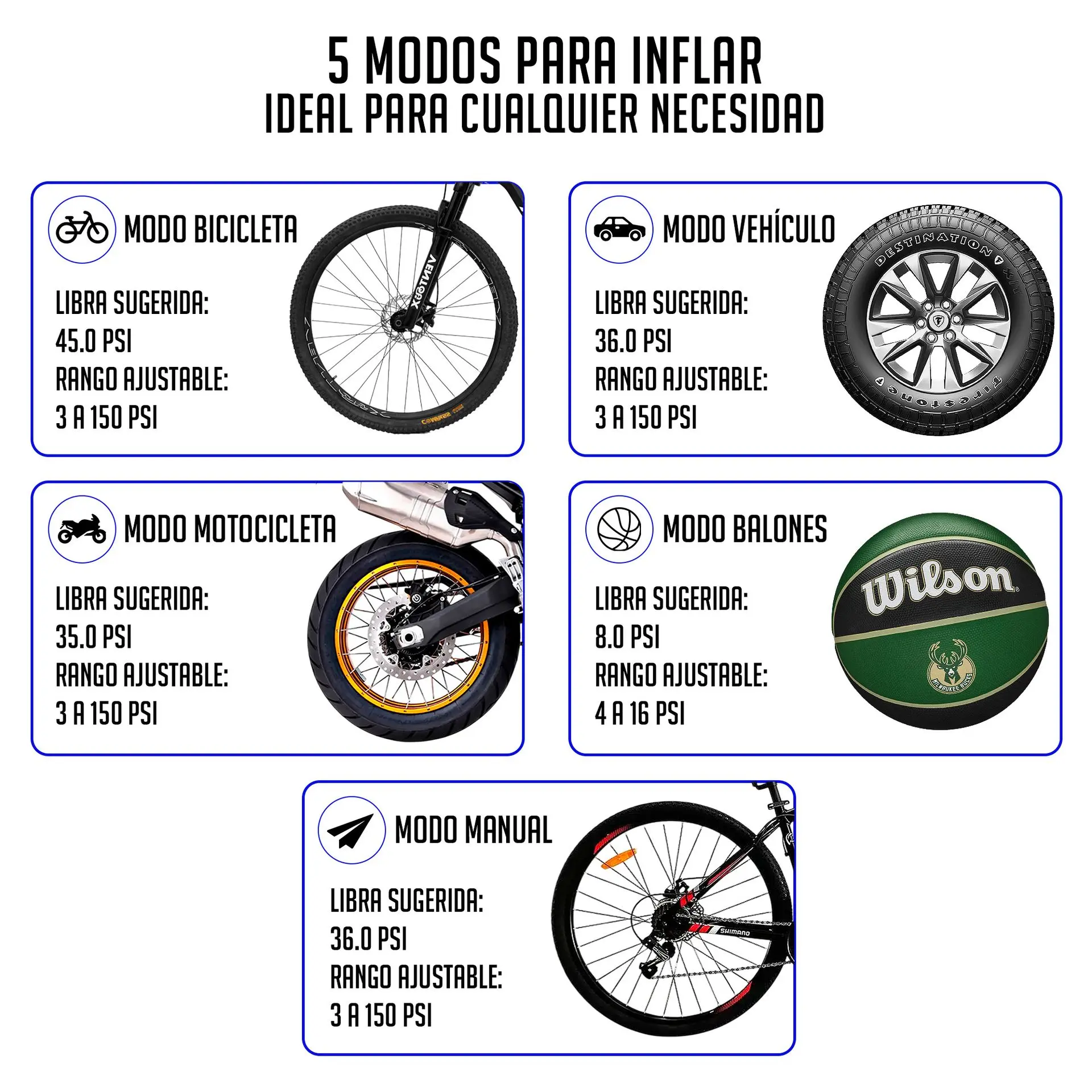 La versatilidad es su mejor cualidad. Gracias a sus diferentes boquillas y adaptadores, este inflador no solo es ideal para tu vehículo, sino que también es perfecto para: